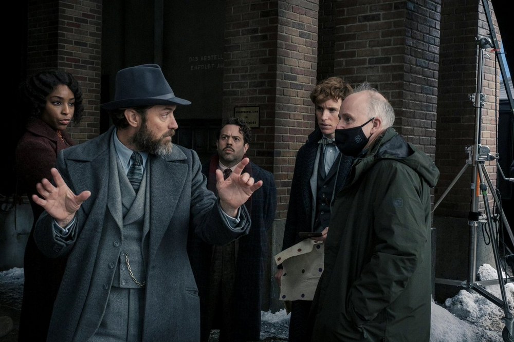 Todas las fotos muestran al director David Yates con mascarilla o cubrebocas al lado del elenco del filme. Algunos de los actores que aparecen al lado de Yates son Eddie Redmayne (Newt Scamander), Jude Law (Albus Dumbledore), Mads Mikkelsen (Gellert Grindelwald), Alison Sudol (Queenie Goldstein), Jessica Williams (Lally Hicks), Callum Turner (Theseus Scamander), William Nadylam (Yusuf Kama), Victoria Yeates (Bunty Broadacre), y Oliver Masucci (Anton Vogel).